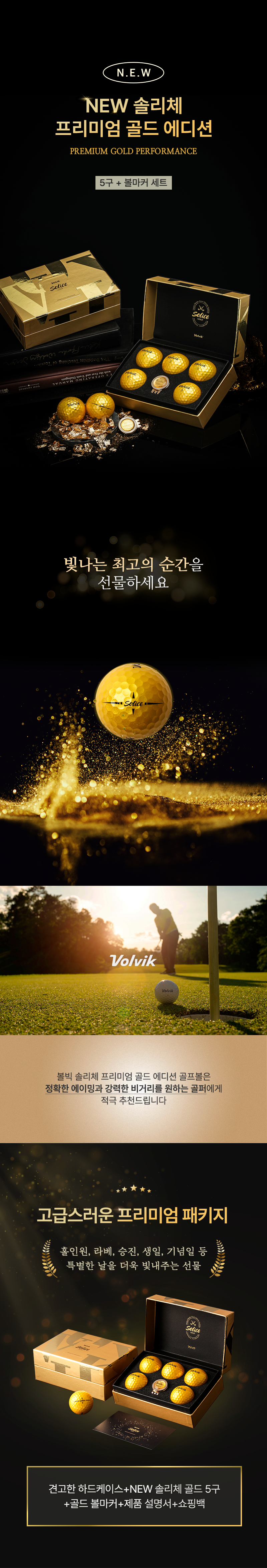 1. 견고한 하드케이스 + 솔리체 골드 5구 + 골드 볼마커 + 제품 설명서 + 쇼핑백
